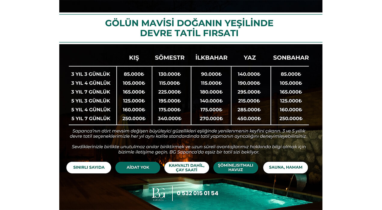 Sapanca’da doğanın kalbinde konumlanan tesisimizde; sevdiklerinizle birlikte huzuru, konforu ve ayrıcalığı aynı anda yaşayacak, her anı keyfe dönüşen unutulmaz bir deneyim sizi bekliyor.